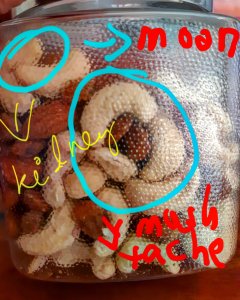 By then I knew it wasn’t me he was referring to…phew! And then he pointed at the jar on the table that had cashews. And pointed out where the mustache, kidney and moon were.