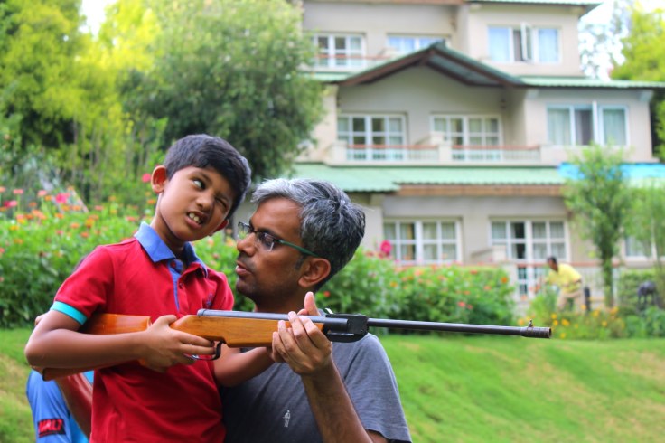 TO showed his chops by giving Red and I a thorough drubbing in Monopoly and the three of us cuddled together under the blankets while it rained and turned the whole area a bit gloomy but pretty nonetheless. He did zip lining from a fairly high point and yelled in joy just when he landed safe on his feet. I, with my usual aim and focus, used the rifled to pop balloons but possibly knocked a few leaves off their stalks. You know…the good stuff!