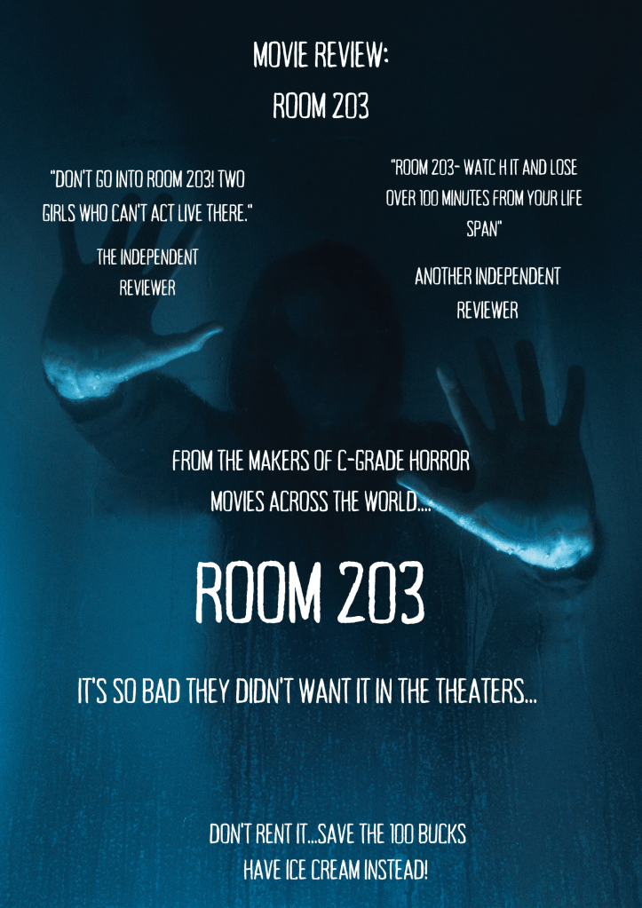 Movie Review: Room 203 (The Poster Version) Share this: Share on Facebook (Opens in new window) Facebook Share on LinkedIn (Opens in new window) LinkedIn More Email a link to a friend (Opens in new window) Email Share on Pinterest (Opens in new window) Pinterest Share on WhatsApp (Opens in new window) WhatsApp Like Loading... Related 2 thoughts on “Movie Review: Room 203 (The Poster Version)” Add yours Crisp and to the point review ..unlike the movie! Ha ha ha LikeLiked by 1 person Reply I kept waiting to be scared… LikeLike Reply Leave a comment Cancel reply Δ This site uses Akismet to reduce spam. Learn how your comment data is processed.