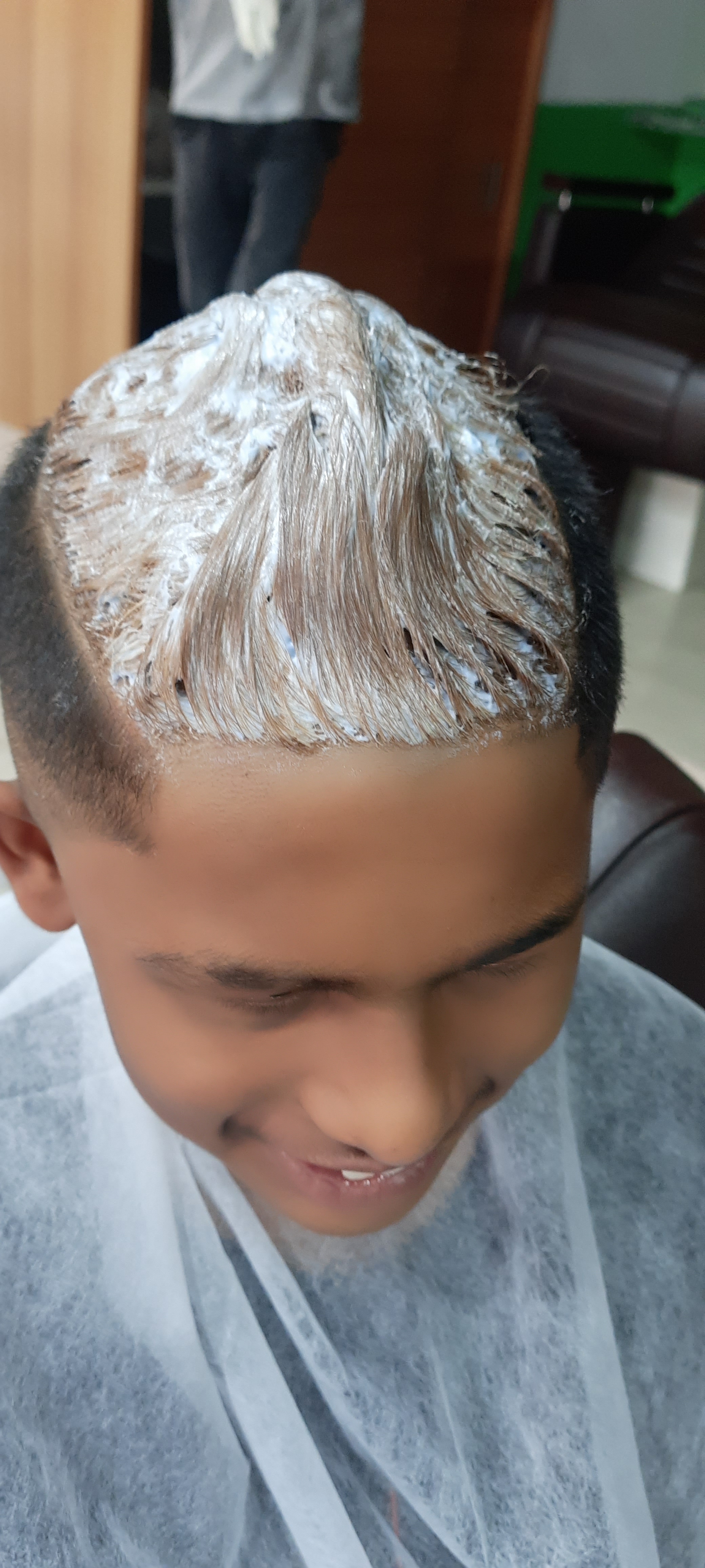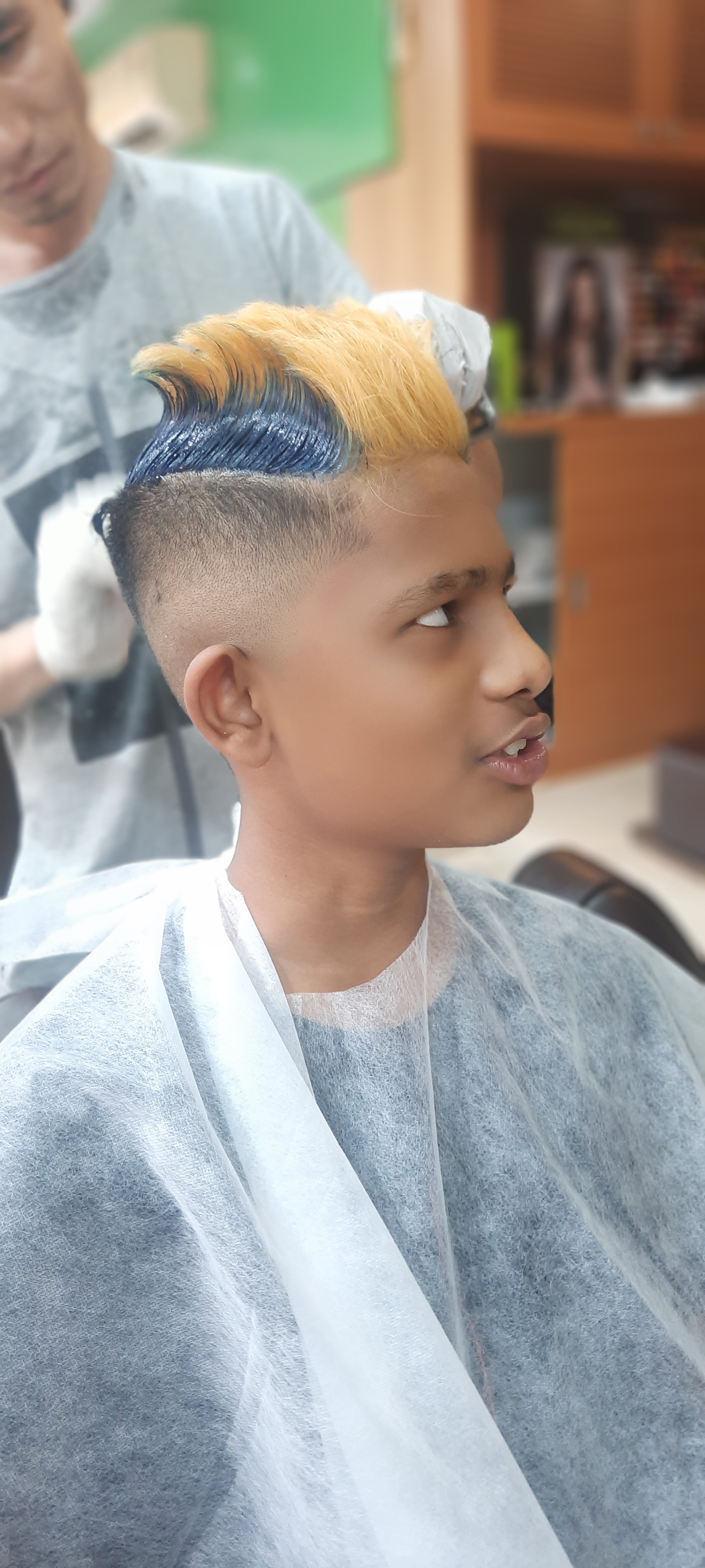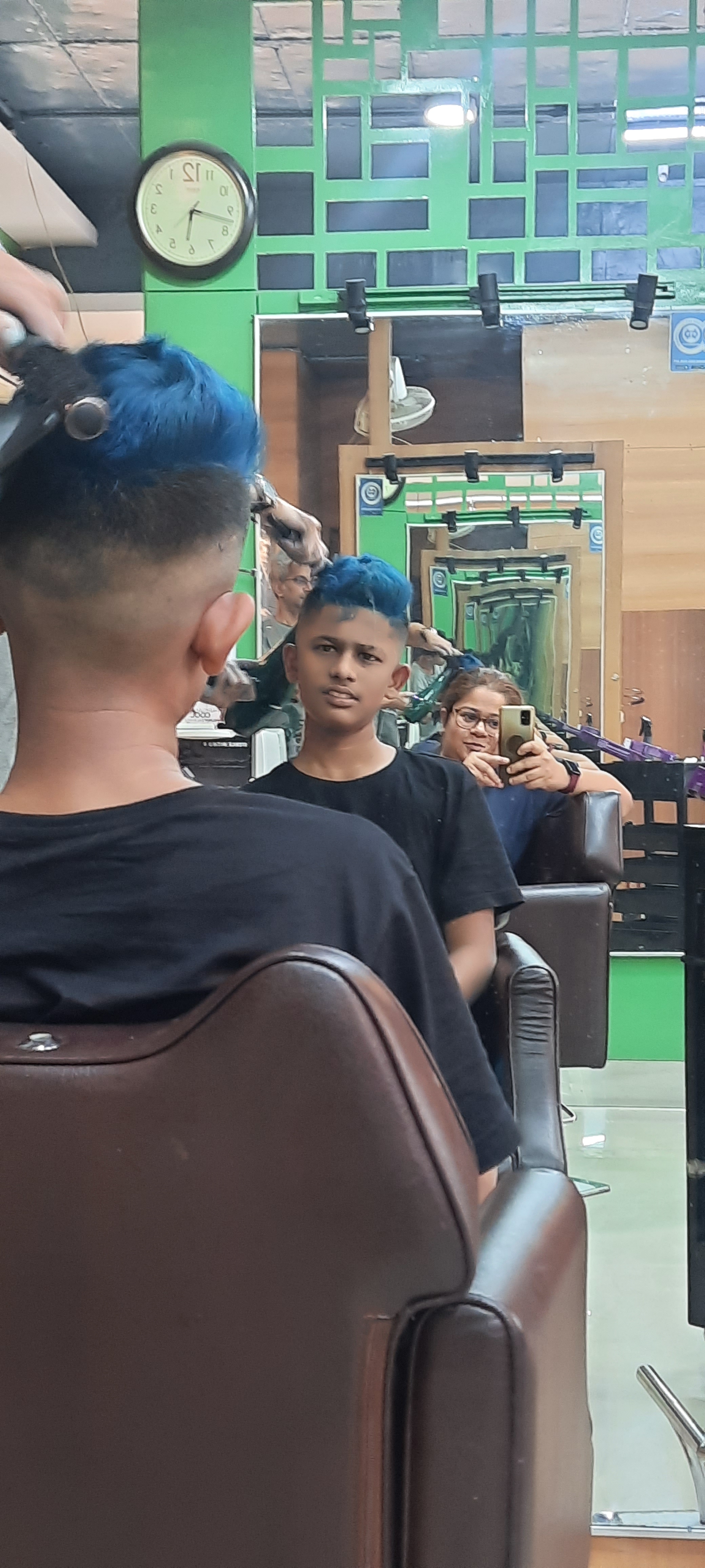 This is how it all went down: existing hair was cut into semi-mohawk/flat top in the style of Shimron Hetmyer followed by bleaching (not a huge fan as it turned out) and dyeing. After the dyeing it was a few days of strutting like a peacock till an encounter with a non-color-protect shampoo turned blue into a deep green. Surf, sun and sand bleached said green till it became light mintish; almost white at first glance. Finally, in deference to the school rules about grooming, a buzz cut ensued which replaced all the green. For now.