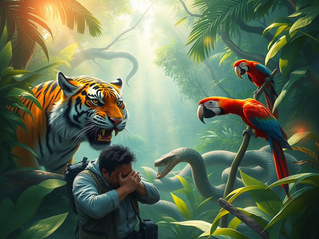 So, on and on he went. First he objected to the tiger in the frame saying anacondas and tigers aren’t found in the same ecosystem. When he found out the setting was Borneo, he let the tiger thing slide. However, he objected to the anacondas. They belong in the Amazon basin. Then there was the inclusion of the howler monkeys who don’t belong in Borneo either.